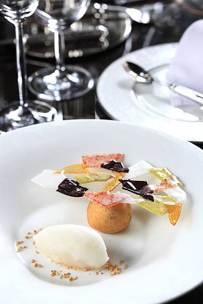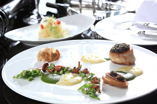 名為鱘魚子佐野生鮑魚搭配北海道野生干貝的這道菜,是將野生鮑魚及北海道野生帶殼干貝使用香煎的方式,煎至表面金黃,外脆內鮮甜的軟Q口感,再搭配上Osietra的魚子醬加以點綴,讓這完美無瑕的海洋風味一次滿足味蕾。