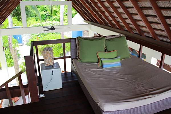 順著樓梯到樓上更是別有洞天,擺放著一個小床和吊床,沒事的時候不妨走上來看看,躺著就可以看到遠方的海景,算是另類的兩人世界。