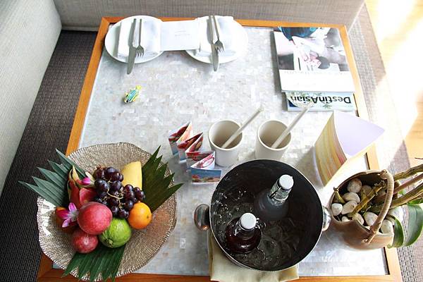 小客廳的桌上已經放滿了迎賓水果和冰涼飲品,同時附上一封手寫的歡迎信。