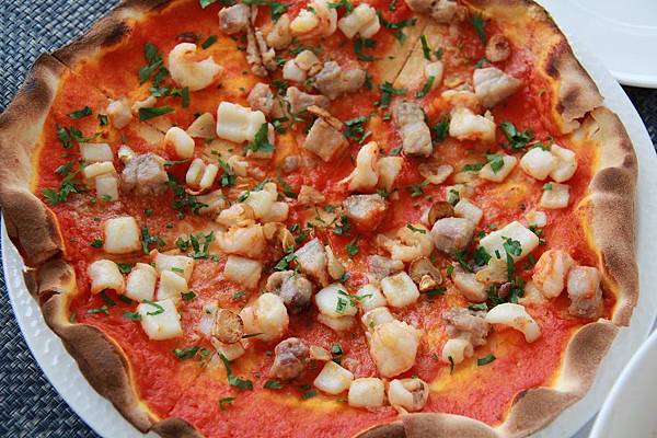 由於距離晚餐時間已經說早不早、說晚不晚,最後選擇點了一份海鮮Pizza和沙拉先來墊個胃。