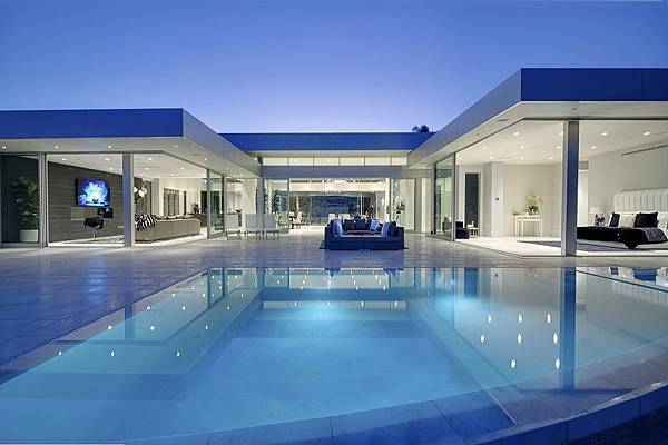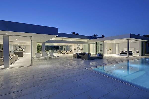 別墅後方的大理石地板延伸出附設有泳池休憩區和躺椅的戶外露台,極目遠眺觀景,城市繁華顯得錯落有致而盡收眼底;玻璃幕牆從外面看像一個巨大的鏡子,將大自然的美景映射出來,隨著視角不同,折射出的景觀也在不斷產生變化,營造個性鮮明的專屬國度。