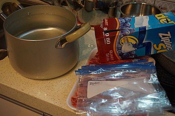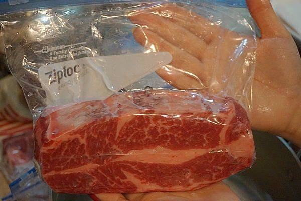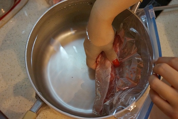 把牛排裝進袋中後,還必須將袋子裡面的空氣排出,使其完全成為真空狀態。最省事的方法當然是直接購入一台家用真空包裝機,不過其實也不用這麼大費周章,只要把袋子全部浸到水裡只留下一點點夾鏈部份於水面上,因為水的壓力能夠將裡面的空氣完全擠壓出,又可稱之為省錢版的真空妙招。