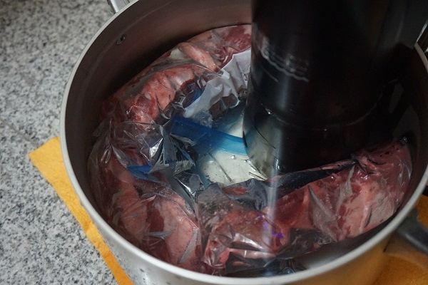 像是這次製作的牛小排,我是將溫度設定在53度、耗時約3小時多完成的,有沒有發現肉的顏色已經與剛放下去時的不太一樣了,時間方面當然是不需要抓得剛剛好,即使超過3小時也不至於會影響口感,亦不會有任何的危險發生,這就是用真空低溫料理食物的好處。