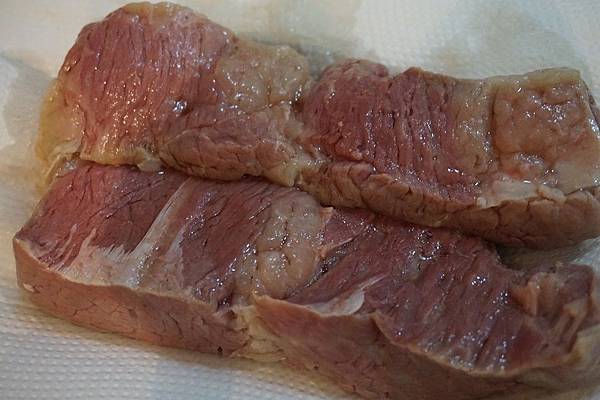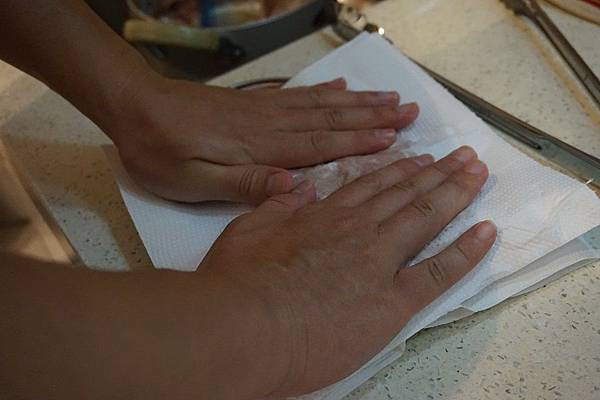 將牛排從袋子裡取出後置於任一盤子裡,以廚房紙巾把牛小排前後兩面的肉汁或血水給完全吸乾,若沒有這個步驟,待會兒可是會影響到牛排表面的色澤。