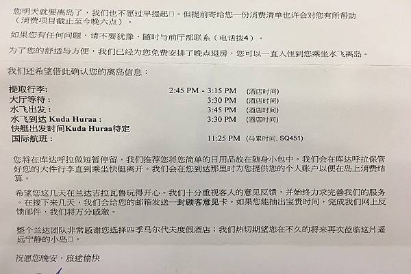 飯店人員在我們離開的前一天晚上,也會在房裡留下一封信,信裡會告知隔一天提取行李和搭乘水上飛機的時間。