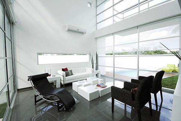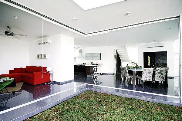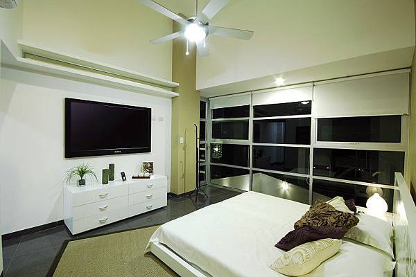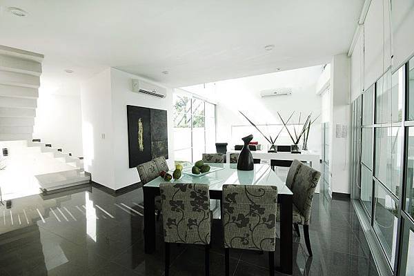 設計師不刻意定義每一層的用途,將所有空間打造成可以隨心所欲的使用。主臥室內簡單的擺設,自然而休閒的情韻油然而生;深色與純白映畫在客廳裡與每個生活角落,顏色規劃讓公私場域畫分的非常清楚,彰顯出空間的獨特個性。其他的傢俱採用了Cassina、Cappellini等義大利設計師作品,與別墅的大膽線條設計非常吻合,提高整體水平。