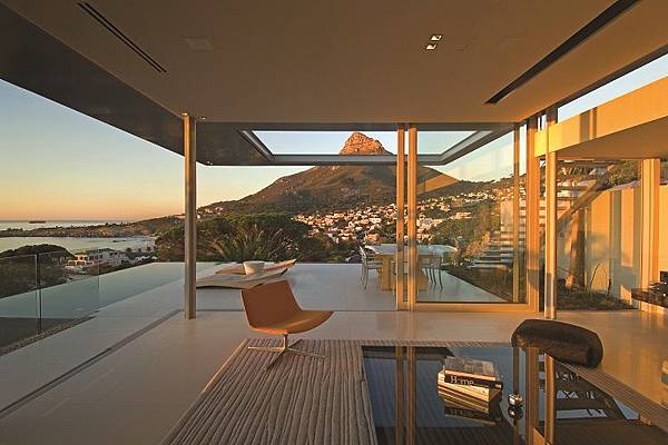 反射的虛實空間風景,為開放互動的客廳與餐廳,提升更為寬敞的視覺感。巨大的玻璃窗後是清澈的游泳池,似乎是漂浮在美麗的風景之上。下方有私人主臥室,更衣室和雙人臥房,雙人房的視野最佳,可看到泳池和附近的小鎮。