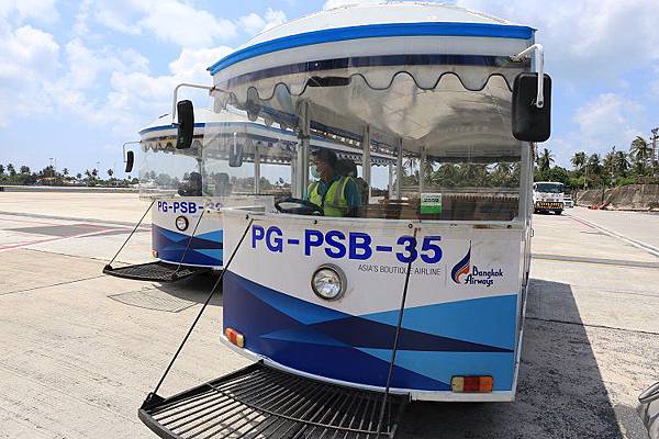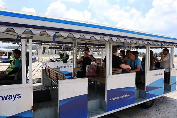 蘇梅島的機場很小,沒有空橋,很多海島國家也都是這樣,早已見怪不怪,不過這種很有特色的小型接駁車還是第一次看到,很像是加長型高爾夫球車和小巴士的綜合體。