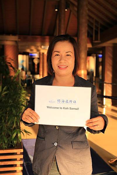 在會面點拿著博海旅行社牌子的女生,就是在蘇梅島當地負責接機的人員,一見到面後除了仔細核對資料和確認接下來幾天入住的度假村以外,重點是她還會講中文喔
