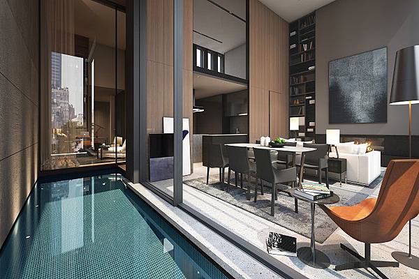 在 Soori High Line 項目裡,底部的樓層給人私家庭院的感覺,其他樓層部分有 16 戶附設24 到 28 英呎長的與眾不同私人游泳池,從主臥一直延伸至客廳,寬敞 開放的無痕視覺設計令場域沒有絕對的區隔,更是營造本項目整體氛圍的亮點。
