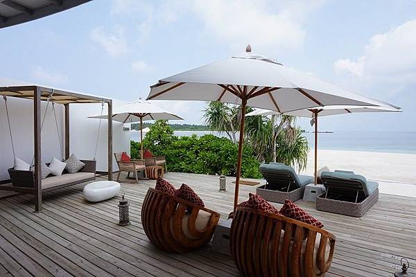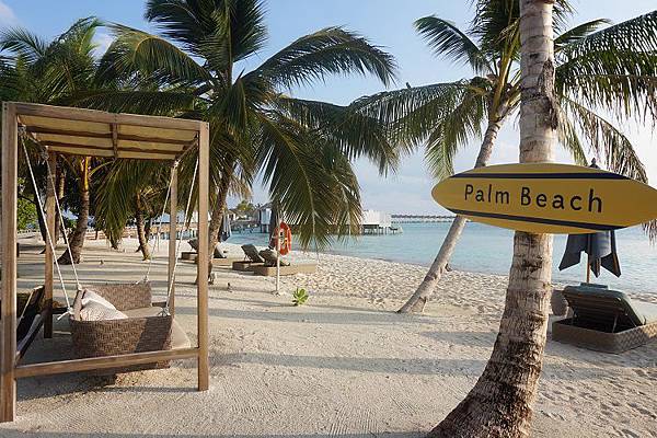 對於住在水上屋的旅客,在木棧橋入口處的旁邊也有一處名為 Palm Beach 的沙灘,面積雖然無法與主泳池旁的沙灘相提並論,躺椅數量也沒這麼多,也因此比較不會被人打擾。