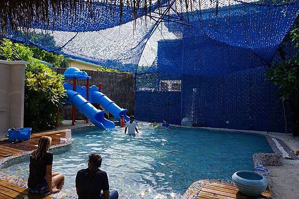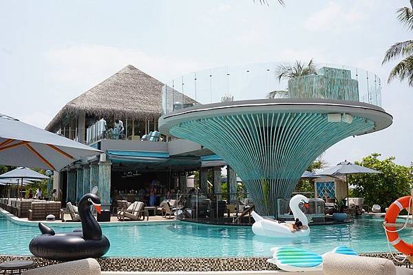 Seaside Finolhu(Finolhu Baa Atoll) 主泳池區域大概是整個島的核心,擺滿各式各樣的玩樂用具,白天看似普通的玩水場所,一旦到了晚上這裡可是舉辦活動的重要場所,到了特定時間可是五光十色,熱鬧到不行。