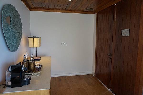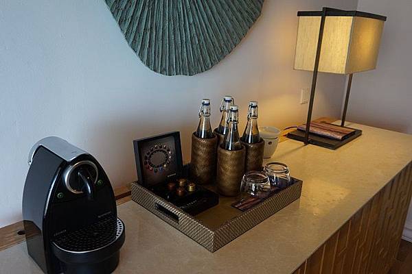 打開房門後不會直接看見睡覺的床鋪,反而先是一個簡單的玄關,檯面上放的玻璃瓶飲用水和膠囊咖啡都是可以免費使用的。