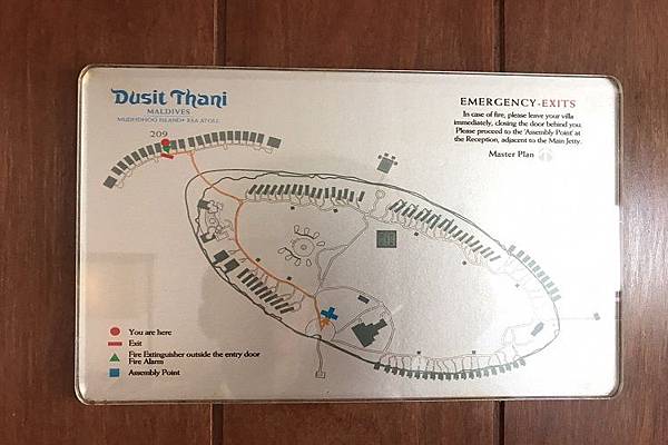 進房後,門口旁的牆壁上也貼有一張圖片,告知遇到危急狀況時該前往何處,也能夠從中得知目前的所在位置。