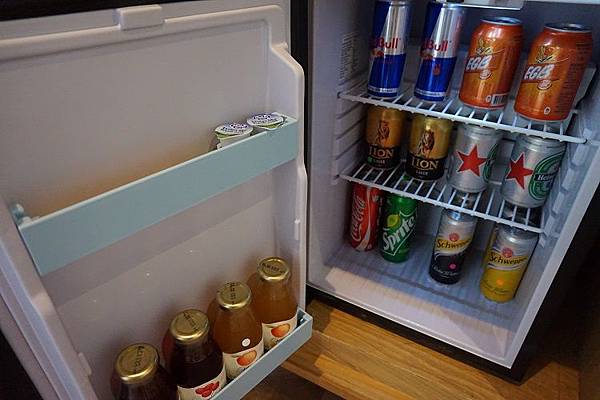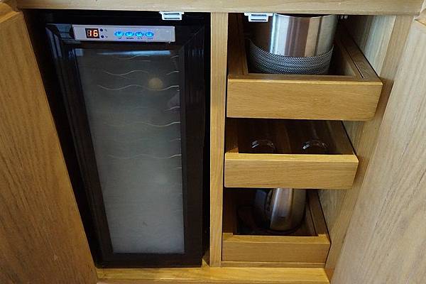 櫃子的最下方有冷藏酒櫃以及一台小冰箱,這些飲品當然都是要收費的。
