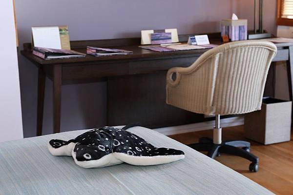 擺在床上的魟魚玩偶可別以為是免費贈送而裝進行李帶回家,如果真的喜愛可以花錢購買,飯店也會將這筆費用拿來作為保育海洋生物的經費。