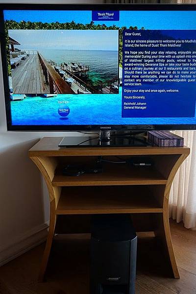 房內的電視也已經是打開的,主畫面則是 Dusit Thani 給予住宿旅客的感謝信。