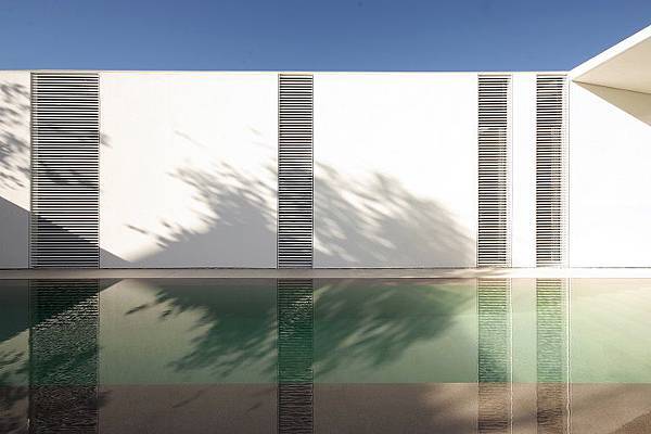 室內生活區透明的室外有兩塊不同大小的露台,較大的朝西,還附設有一個超乎想像的夢幻游泳池,裡面還有兩塊綠化地;較小的露台朝東,也有兩塊綠化地,種植橄欖樹。4米高的房頂能夠擋住朝西的一面,因此夏天的時候戶外休息區和用餐廳都是陰涼的,冬季時地板加熱系統通過屋頂的光能板提供能量用電熱泵進行運轉。