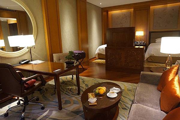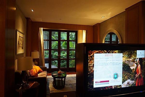 入住的房型是園景庭院房,先用這張來讓大家瞭解房間的大致模樣,客廳與臥室基本上完全聯在一起的,僅用一個電視與櫃子為兩個區域做出區隔。