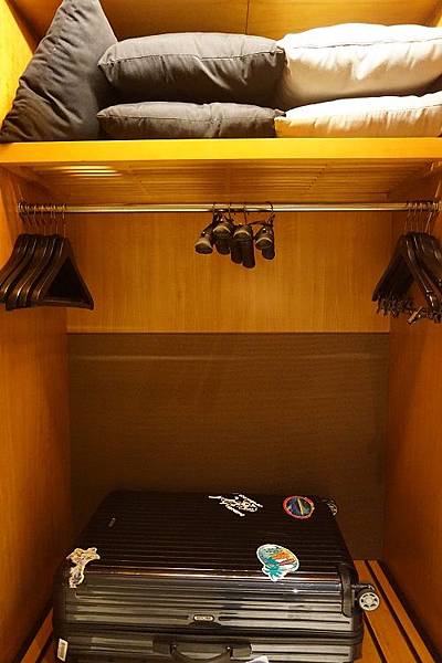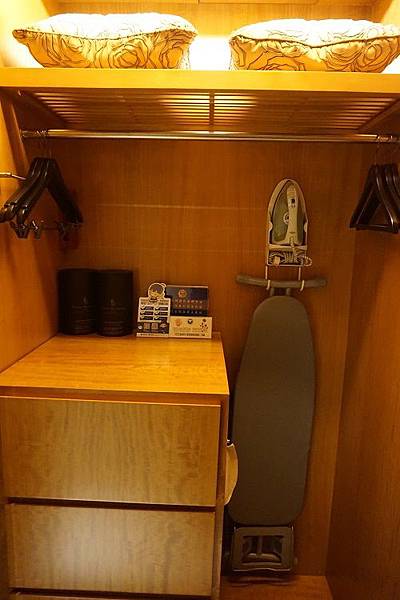 玄關的櫃子也務必要打開,裡面可是大有玄機,可以擺放大型行李、掛上厚重的衣物,另外還擺放各式各樣的抱枕可供選擇,以及熨斗和燙衣板。