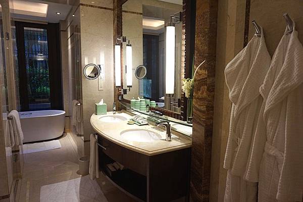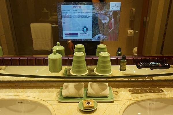 浴室的鏡子裡內嵌上一個電視螢幕,另外除了沐浴用品以外,杯子、毛巾與洗臉台基本上都是成雙成對,不用擔心早上要輪流刷牙洗臉。