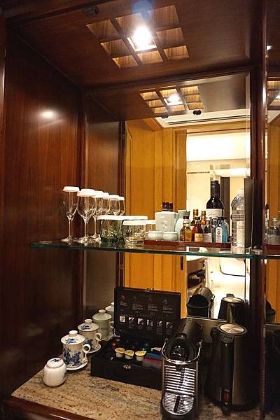 面對廁所的檯子上則擺滿酒類飲品,檯子下方則有一個小冰箱,唯一不用收費的就屬那台 Nespresso 膠囊咖啡機,每天打掃完房間後都會把膠囊咖啡補滿。