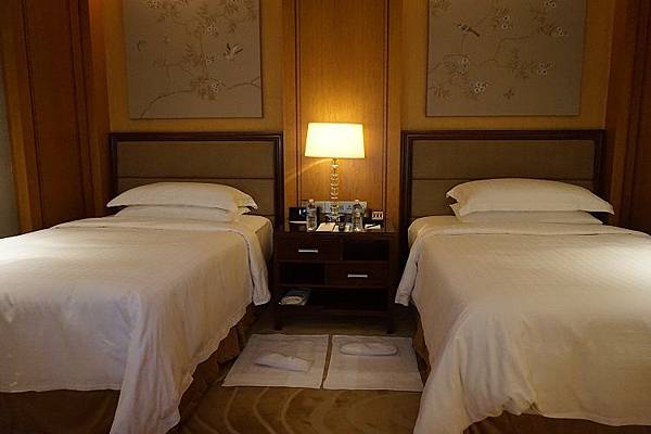 先從床舖這邊看起好了。這次預定的是兩張單人床,傍晚服務人員會趁著沒人在房間的時刻,進來房間稍微再打掃一遍,另外在地上擺放地墊與拖鞋,以及把房間的窗簾給拉上,間接說明了夜晚的到來。