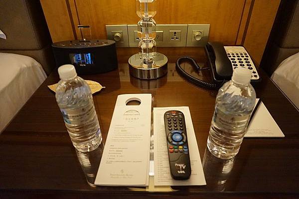 床旁邊桌上每天都會補充兩瓶小罐的礦泉水,至於那台黑色時鐘其實也是一台音響,連接上手機以後即可播放音樂。