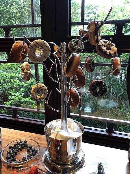 甜甜圈刻意掛在裝飾品上,而非按照一般的方式放置,仔細一看後才發現,這座銀色的裝飾品不正是四季酒店的圖像上那棵樹嗎!!