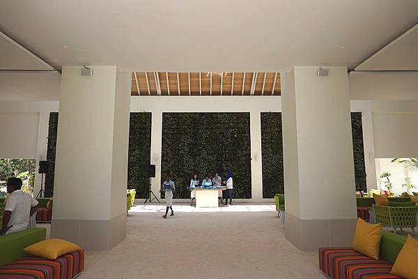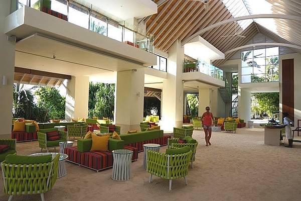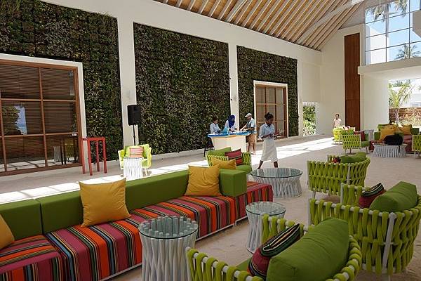 裡面空間極大且呈開放式設計,挑高採光明亮中充滿自在舒適氛圍,所有的沙發與座椅都配上亮色系的色調,為心情做出最佳的調適。另外還可以走到樓上,從較高的位置觀賞Kandima周邊景色。