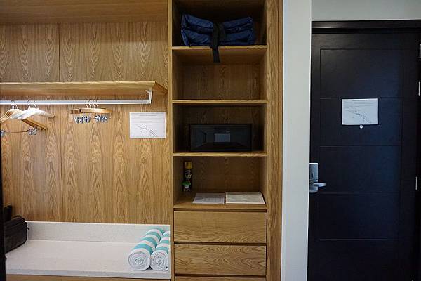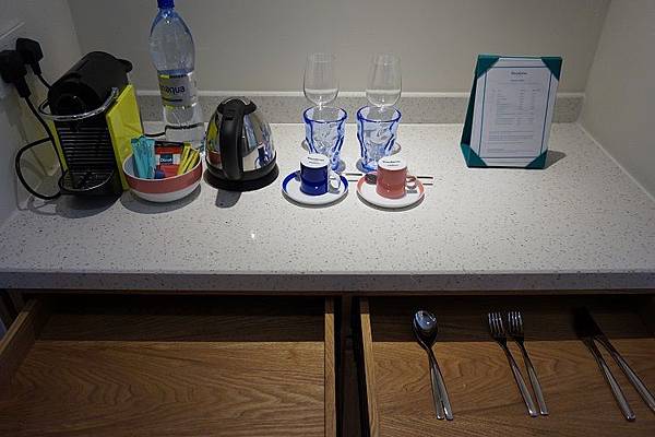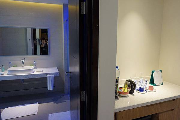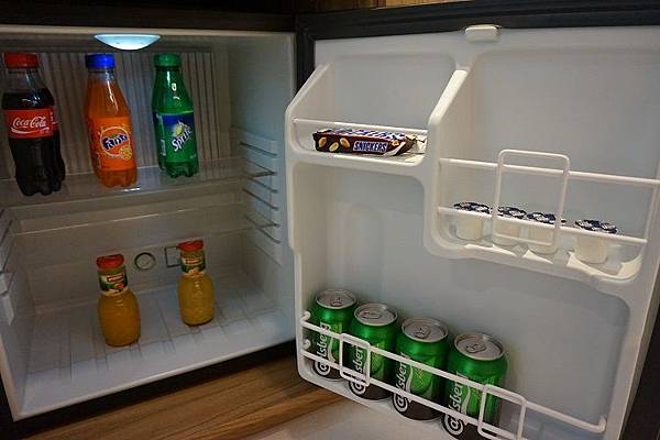 Mini Bar 就在廁所門旁,檯面上的用品和冰箱裡的飲品也都是挺陽春的,除了杯子以外其他東西幾乎都未使用到。