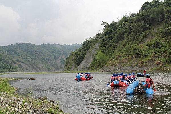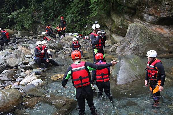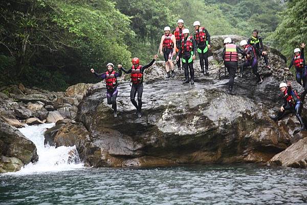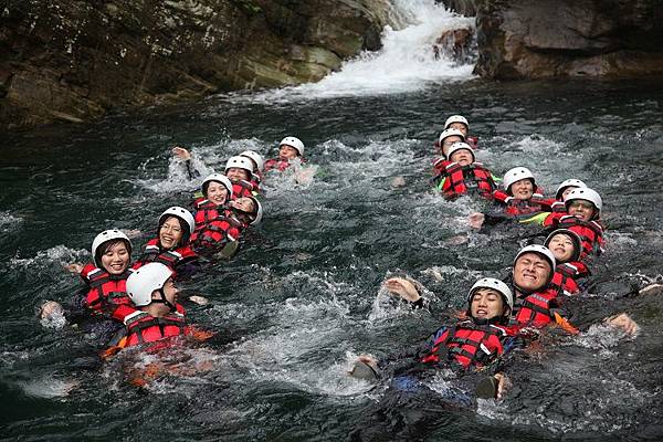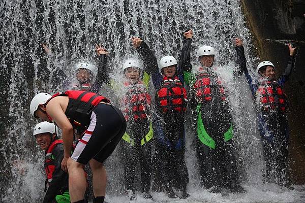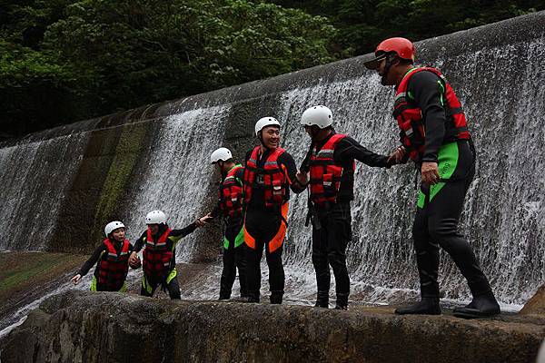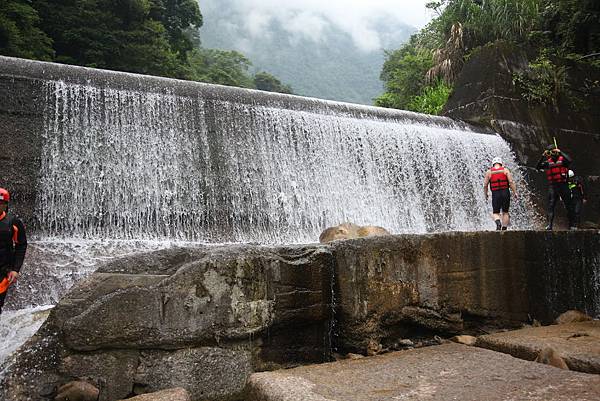 緊接著,馬上面臨的是要沿著繩索爬上攔沙壩頂端,高度約5公尺,算是全程最困難的攀爬段,這裡須由指導教練先徒手攀岩爬上頂端之後架設繩索,再讓隊員拉繩攀爬而上。一夥人拉著繩子互相協助往上游挺進,手緊抓著手,很容易營造共患難的革命情感,又能挑戰自我,這也是溯溪的迷人之處。