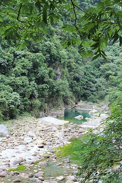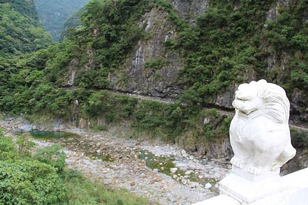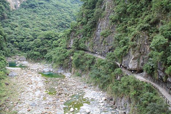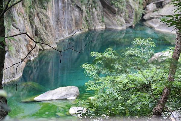 下方的砂卡礑溪水終年清澈,宛如遺世深藏的秘境,河床上巨岩林立,溪水流經此處,溶解大理石中所含的碳酸鈣成份,藍綠自在水中渾然天成,令人悠然神往!
