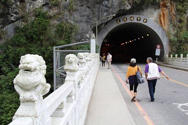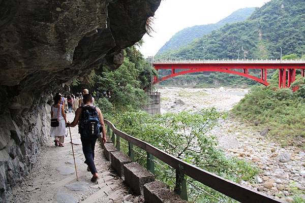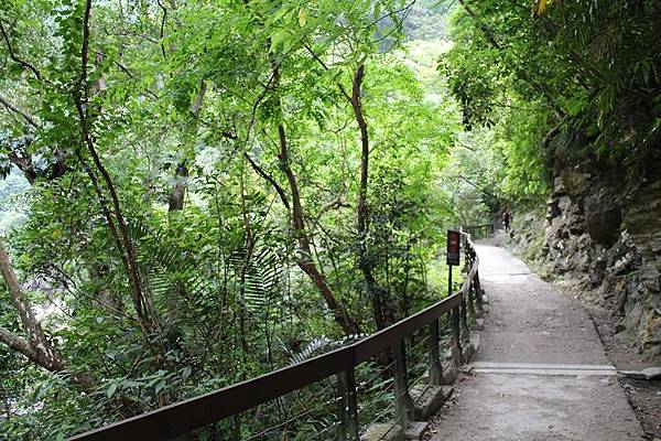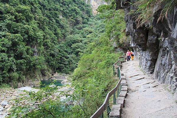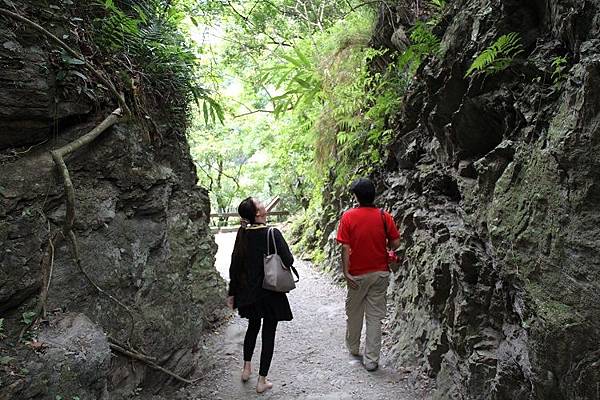 步道全程平緩易行,上方有突出的峭壁遮擋雨水,路線倚傍著砂卡礑溪而行,兩岸可說是一幅褶皺的岩雕壁畫,在各式線條紋路的意涵琢磨下,任憑想像和欣賞大自然的鬼斧神工。