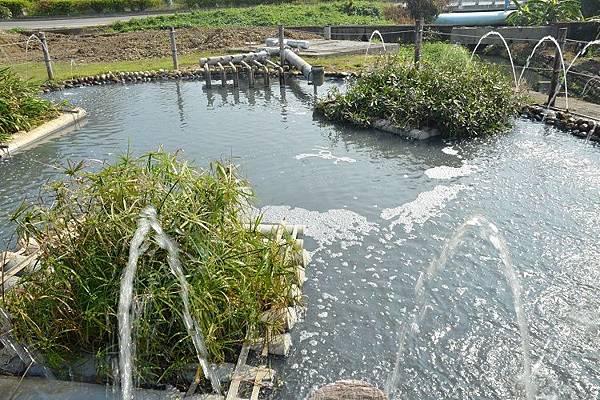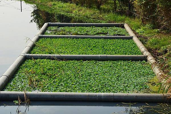 園區中左方的曝氣區,功用在於將新鮮空氣打入水中,提升微生物的分解效率;緊接著進入沉澱區處理完畢後,分別流向溼地一區及二區,朝水中一望,即可看見如香蒲、台灣水龍及紙莎草等十多種植物,不僅美觀,更孕育許多水中動物。