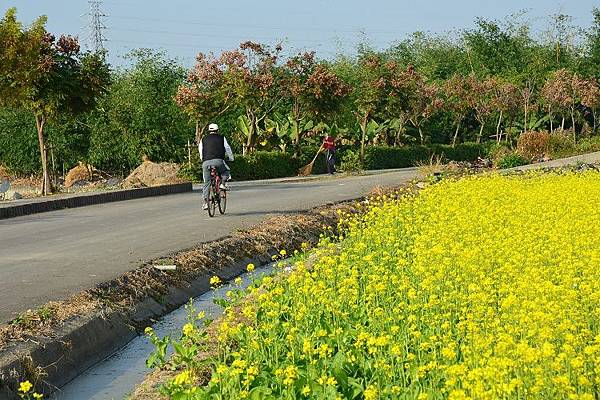 來到1.5公里處,抵達大湖公園時,車道旁的稻田和甘蔗景象,瞬間轉化成一片黃澄澄的油麻菜花田,微彎著腰,不時隨著微風擺動起舞,宛如一波又一波的金黃色浪花迎面襲來,令人忍不住駐足欣賞一番。