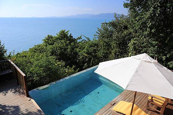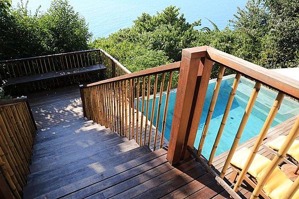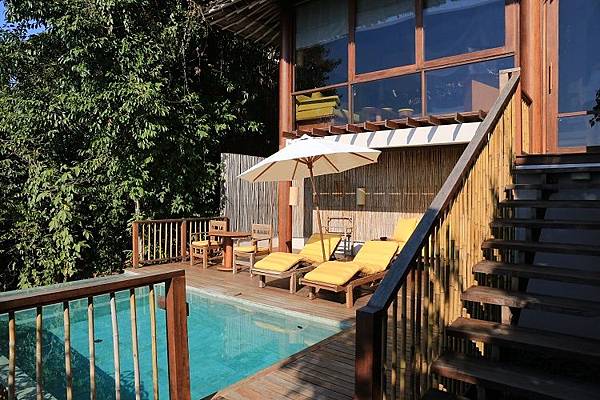 從房間走下樓梯就是Six Senses 六善酒店別墅的戶外露天平台,還有著一座泳池與幾張躺椅,其實我心目中最理想的,是一打開門就可以跳進泳池的快感,泳池與房間都在同一個平面上。不過這樣泳池在樓下的設計,會讓人有種自己住在兩層樓別墅的驕傲感。