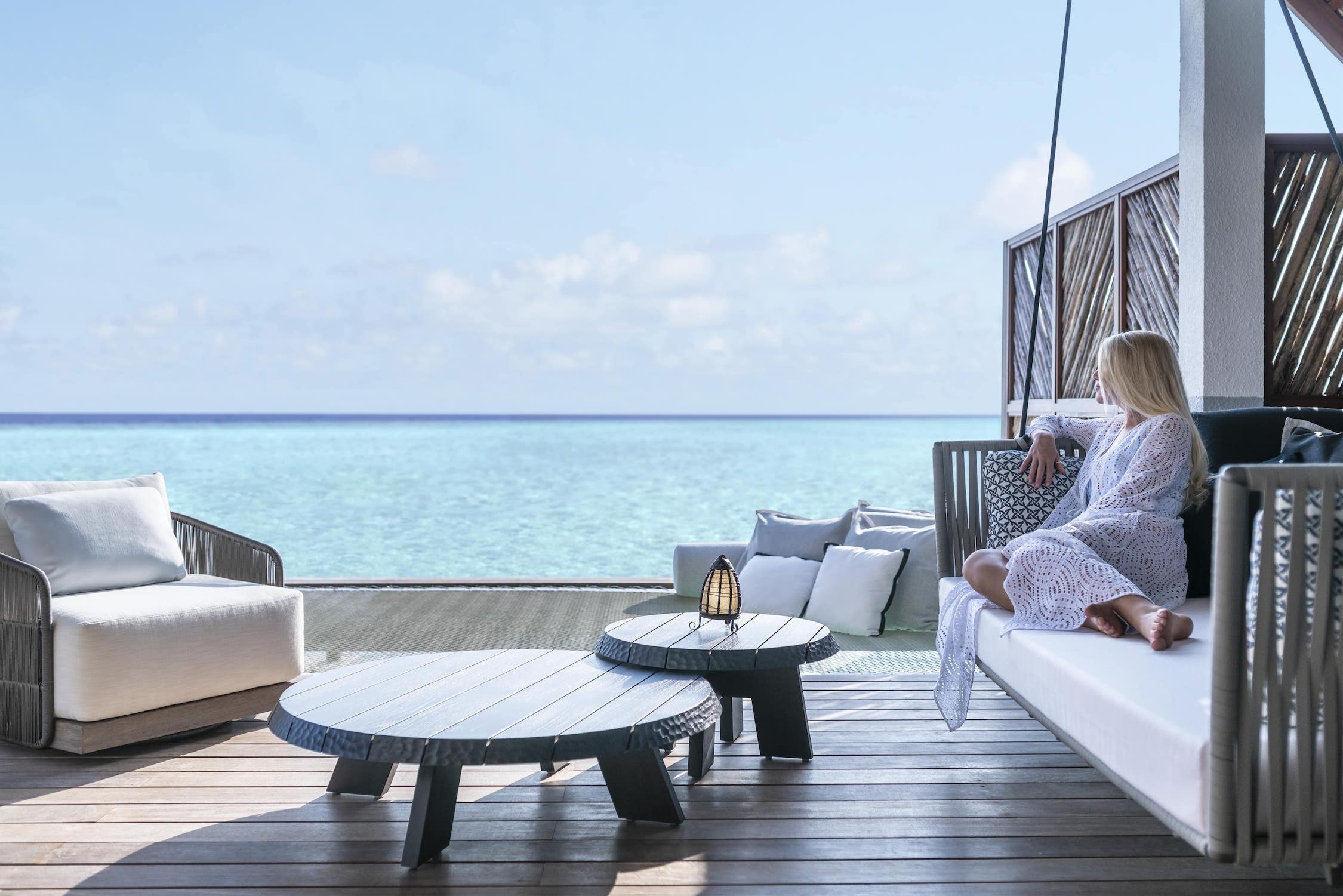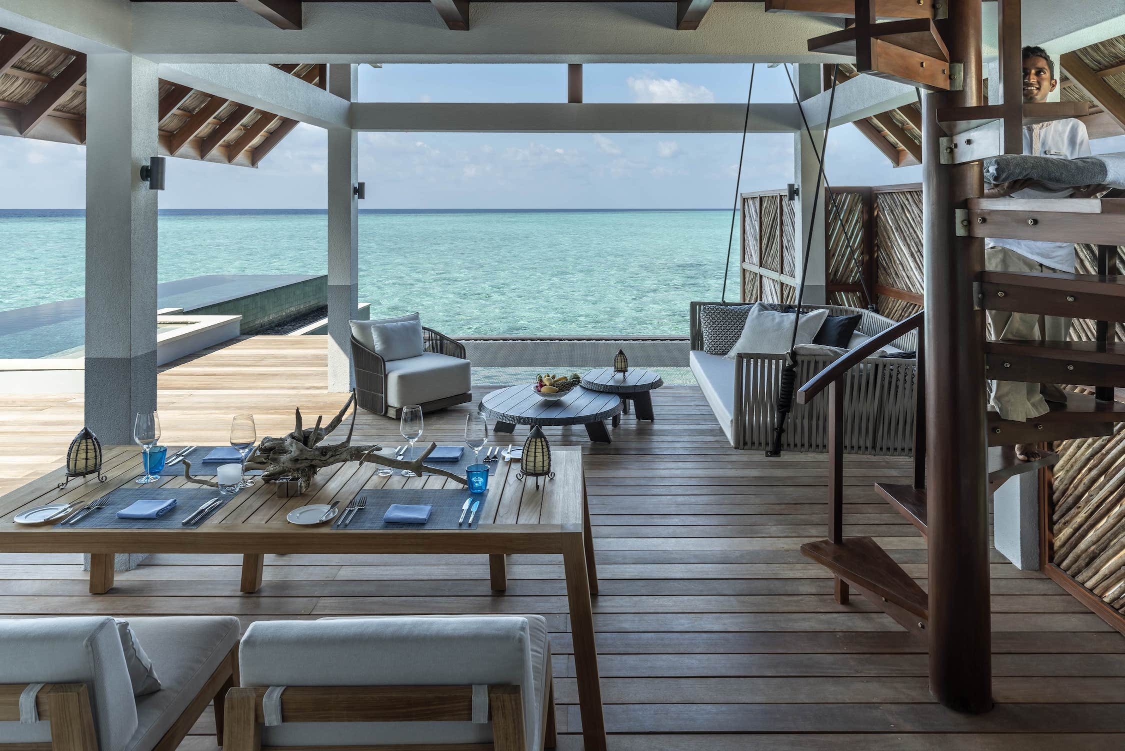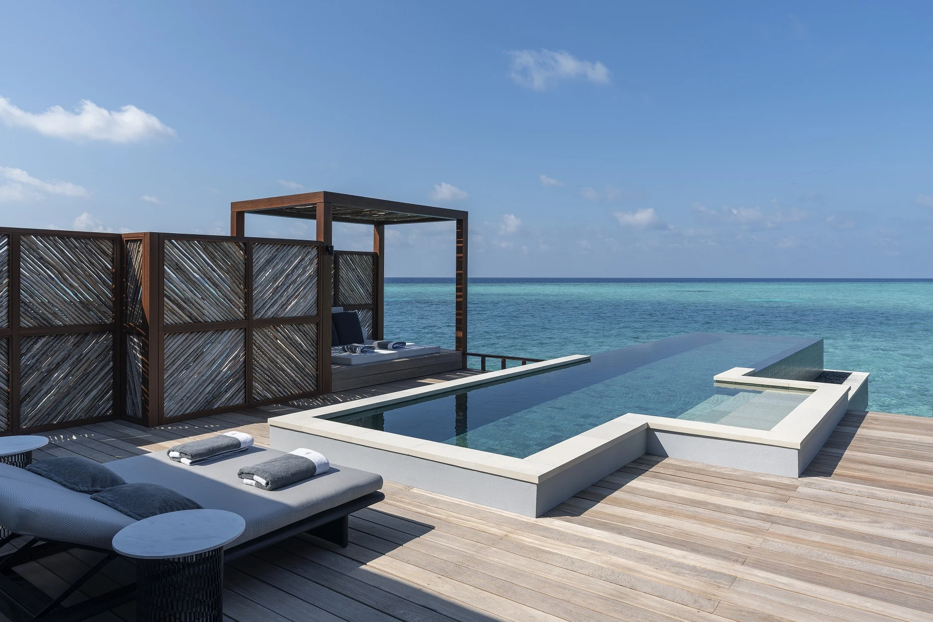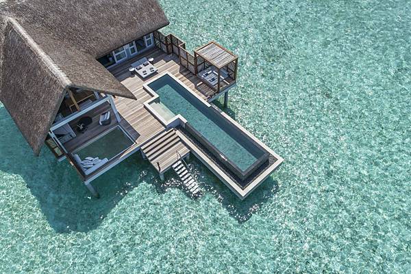 四季酒店蘭達吉拉瓦魯島 Four Seasons Landaa Giraavaru水上別墅經過全面升級後,不僅每間別墅都有著無邊際泳池,還營造了不受陽光干擾的海濱生活空間,有著附有餐桌和椅子的用餐處、鞦韆沙發等,這些都位於12米(40英尺)長的游泳池旁,該游泳池延伸到潟湖中,可將印度洋一覽無餘。