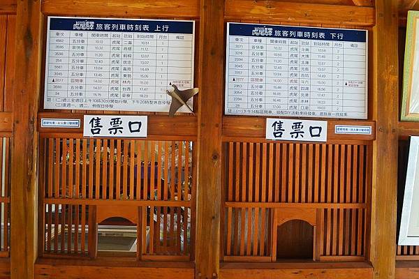 火車站內最能勾勒起人們想像空間的舊式售票口,後方區域改為販賣部,主要販售文創商品和古早味食品,前方牆面上的木製旅客火車時刻表,也已改為虎尾驛五分車的到站時間。