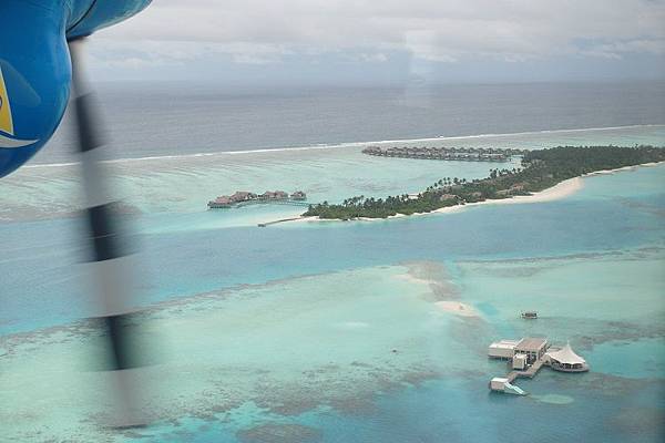 整個飛行時間大約為40分鐘,沿途更是能夠看見下方形形色色的度假村,當出現這個單獨位在海上的白屋頂建築,也就代表Niyama 尼亞瑪度假村到了,因為那正是著名的海底酒吧入口處。