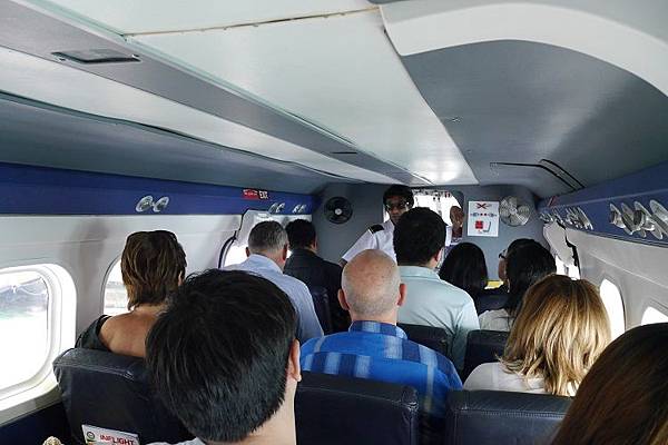 水上飛機的艙內空間極小,沒有任何空調,僅最前方的左右兩側上各有一台小風扇,但是只有位在第一、二排的人才能吹到,人一多起來機艙裡會顯得更悶熱,而且吵雜的引擎聲更是不絕於耳,隨身帶上一把扇子或小電扇會是個好主意。