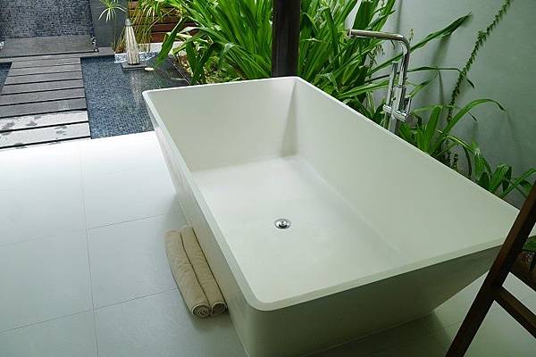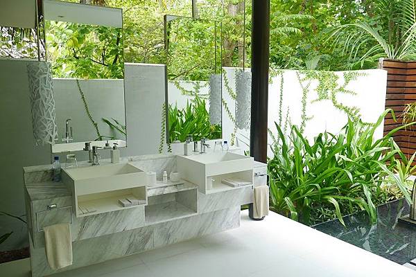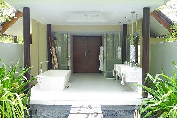 廁所與淋浴空間其實是位在別墅的另一側,與戶外的私人泳池空間等於是一東一西或一南一北的意思。比起室內場域,我更喜歡的是這裡,這種半露天的佈置設計就是很有海島度假風情,而且洗手台、浴缸和地面這種白色系的設計, 等於是締造出一片清新明亮的純淨私人空間,真的是完全擊中自己的喜好!