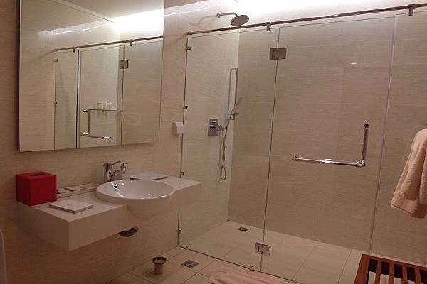 換個角度來看,還是能體現出這裡既簡單又優雅的設計,整個空間一目瞭然,照片中兩處玻璃門即是廁所和淋浴間。