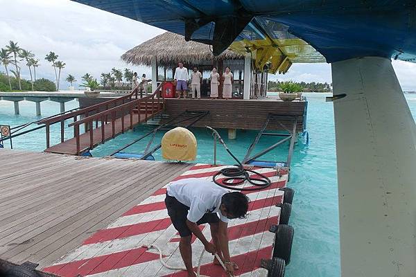 抵達 Niyama 尼亞瑪度假村後,可以發現水上飛機是直接停靠在碼頭旁,服務人員也會伸出手主動幫忙拿些隨身物品。有些度假村是水上飛機會停在海中央,再由快艇接到島上,這樣的差異處主要是考量到水上飛機起降的聲量影響到在房間裡的旅客。