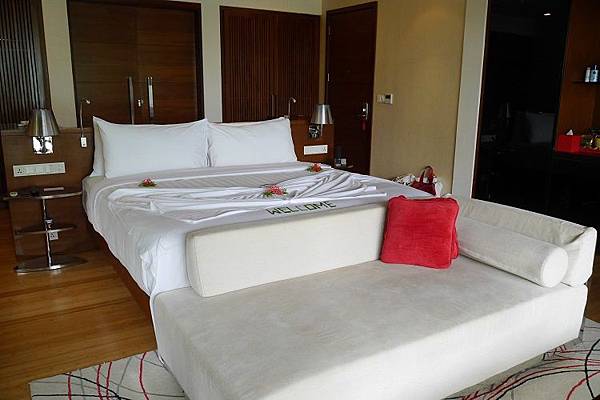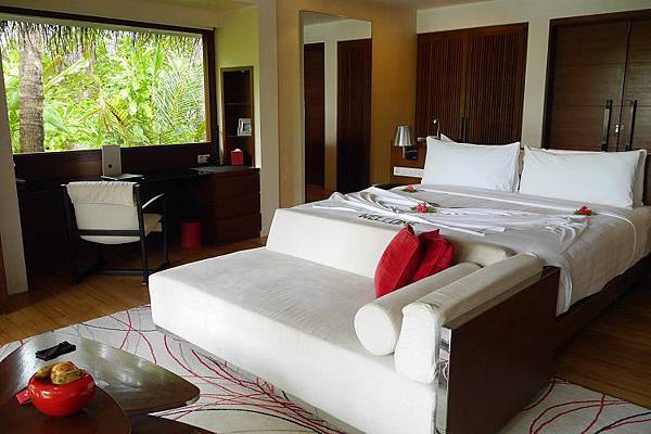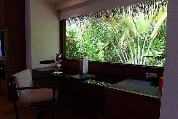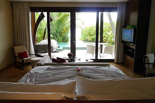 入住的房型是沙灘泳池別墅 Beach Pool Villa,一進門後就能看到自己的床正對著戶外私人泳池這樣的景象,確實有點讓我眼睛為之一亮,整體室內空間不算廣闊但是很方正,不致於有空間被浪費的情形發生。