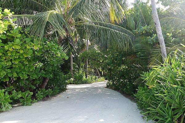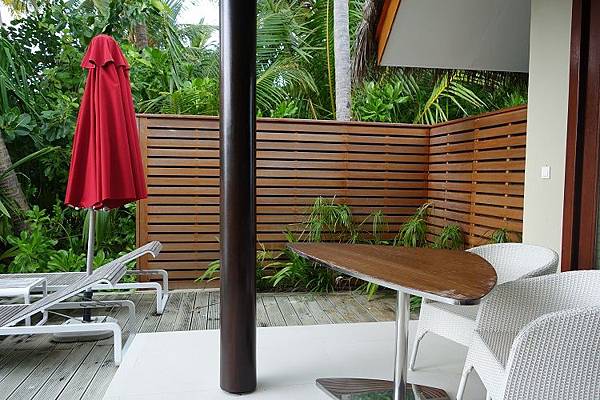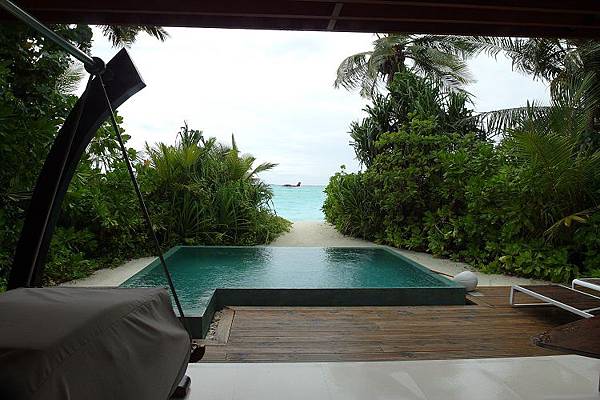 打開床鋪前面的落地門以後,就是私人露台和泳池,為了顧及旅客的隱私,周圍的植物都比一個成年人的身高還要高,另外還留有一條小徑可以直接前往沙灘和大海。