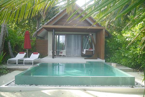 這張照片就是 Niyama 尼亞瑪度假村沙灘別墅戶外空間的概況,整體沒有到寬敞開闊、泳池面積也不大,但是任何時候只要待在這裡都能感受到一股很放鬆的氛圍。