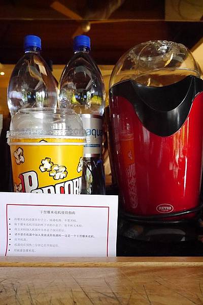 櫃子上最特別的就是這台機器,旁邊有附上說明書和原料,自己在房間裡就能做出一小桶的爆米花來解解嘴饞。