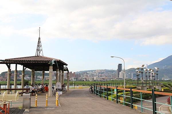 涼亭的遮蔽性極佳,坐在木椅上任由微風迎面吹來,舒爽又涼快,兩旁更設有自行車停放架,停妥鐵馬,從涼亭就可以看到關渡大橋身影。