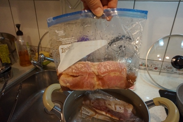 把牛排裝進袋中後,還必須將袋子裡面的空氣排出,使其完全成為真空狀態。最省事的方法當然是直接購入一台家用真空包裝機,不過其實也不用這麼大費周章,只要把袋子全部浸到水裡只留下一點點夾鏈部份於水面上,因為水的壓力能夠將裡面的空氣完全擠壓出,又可稱之為省錢版的真空妙招。